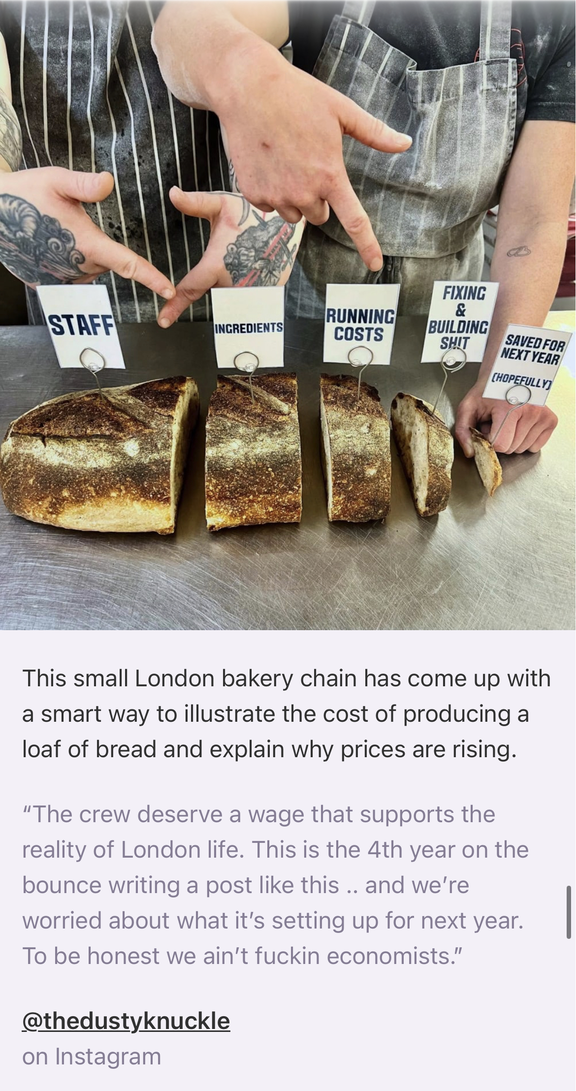 It reminded me of a newsletter I get from a local cafe. They sent out a mail-out about their own rising costs after a customer complained about the price of a coffee. Their email didn’t have an image as clear as this one, but it covered the same ground. It is definitely easier to slice up a loaf of bread to show the “why” than it is to do the same with a cup of coffee.