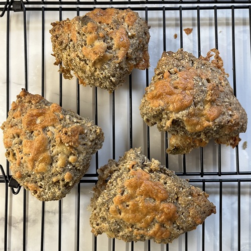 Last weekend, at a cafe in Rottingdean, I had a lovely cheese scone. It wasn’t exactly Zoe-friendly, but it was soft, moist, and delicious. I enjoyed every bit of it. It got me thinking, so I had a little chat with Claude to see if I could come up with a version that worked better for my scores.