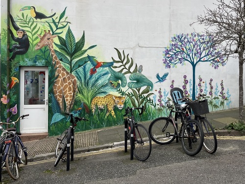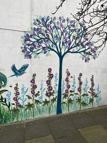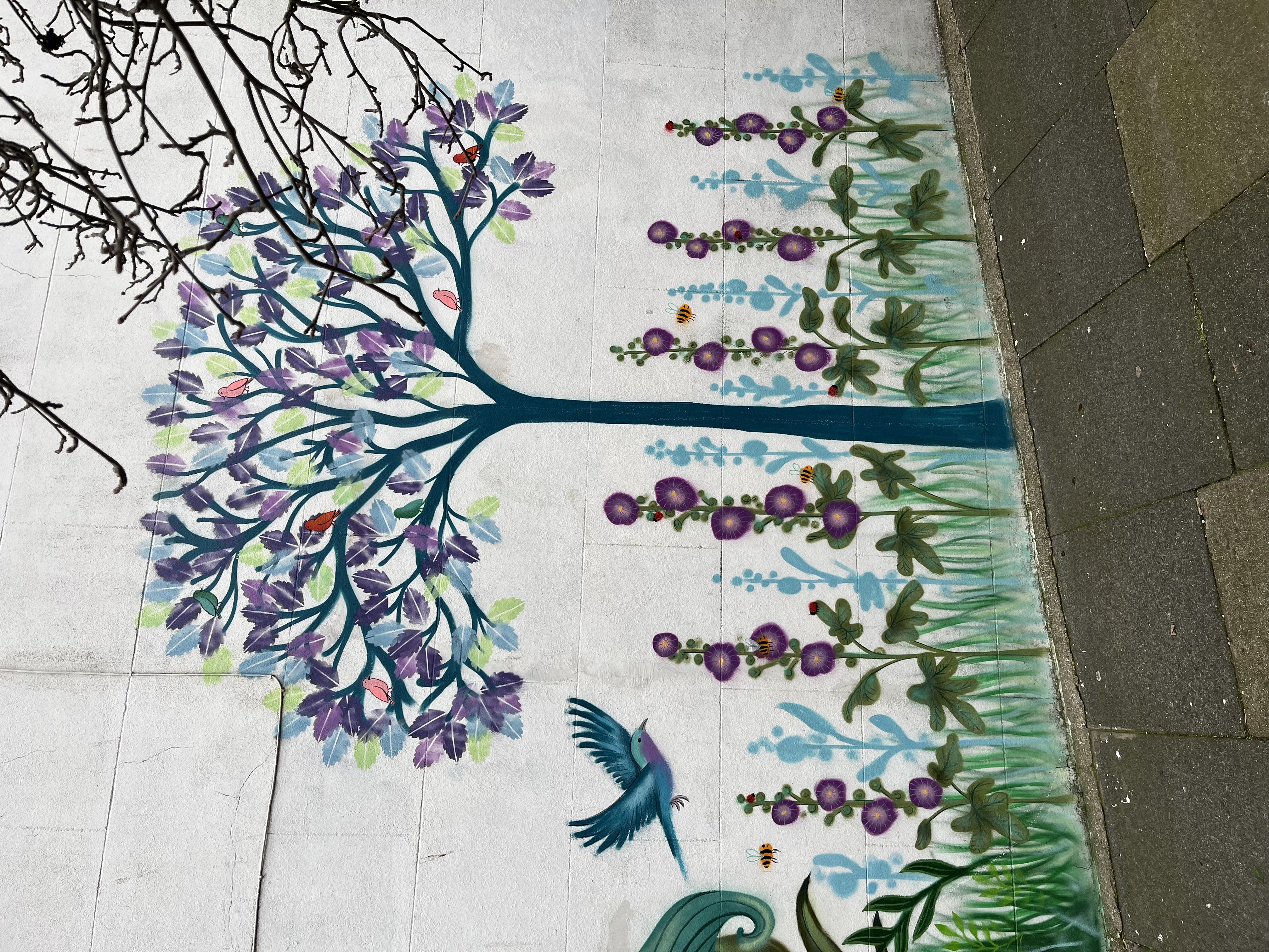 We spotted this wonderful street art as we walked around Brighton today. This whole mural is fantastic, but the details are what sets it apart. I was particularly enamoured of the side with the tree and the flowers. It’s in the kind of colour palette I love, with the beautiful blue tones. But what really caught my eye were the plants beneath the tree, especially the tiny bees and ladybirds busy around the stalks.