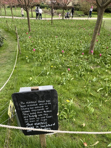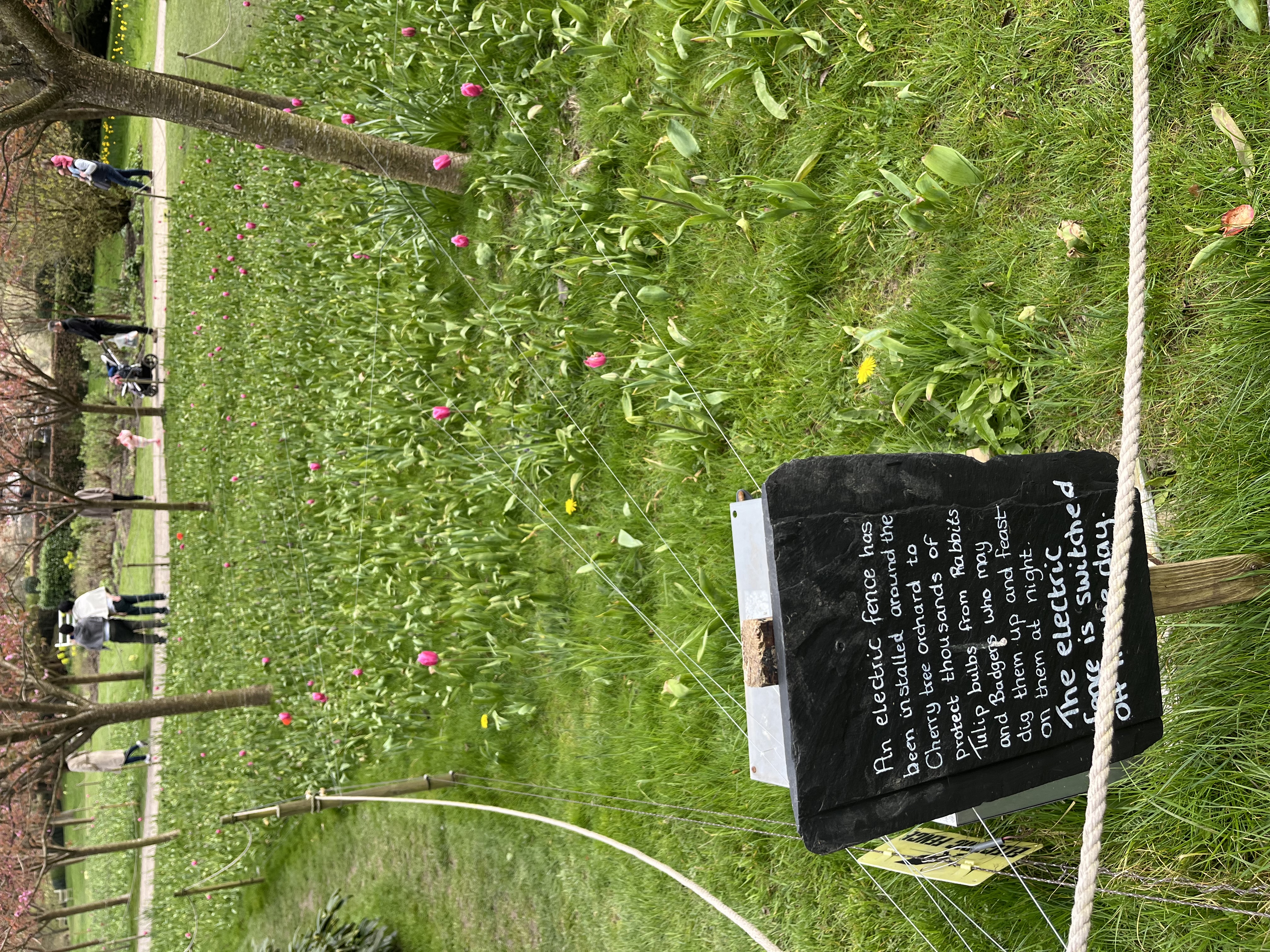 I was especially keen to head back because of an intriguing sign we saw in December about an electric fence. It was put up to protect thousands of tulip bulbs from hungry badgers and rabbits. While I think we were a little early to see the tulips in their full glory, it looks like the fence has done its job of keeping the bulbs safe.