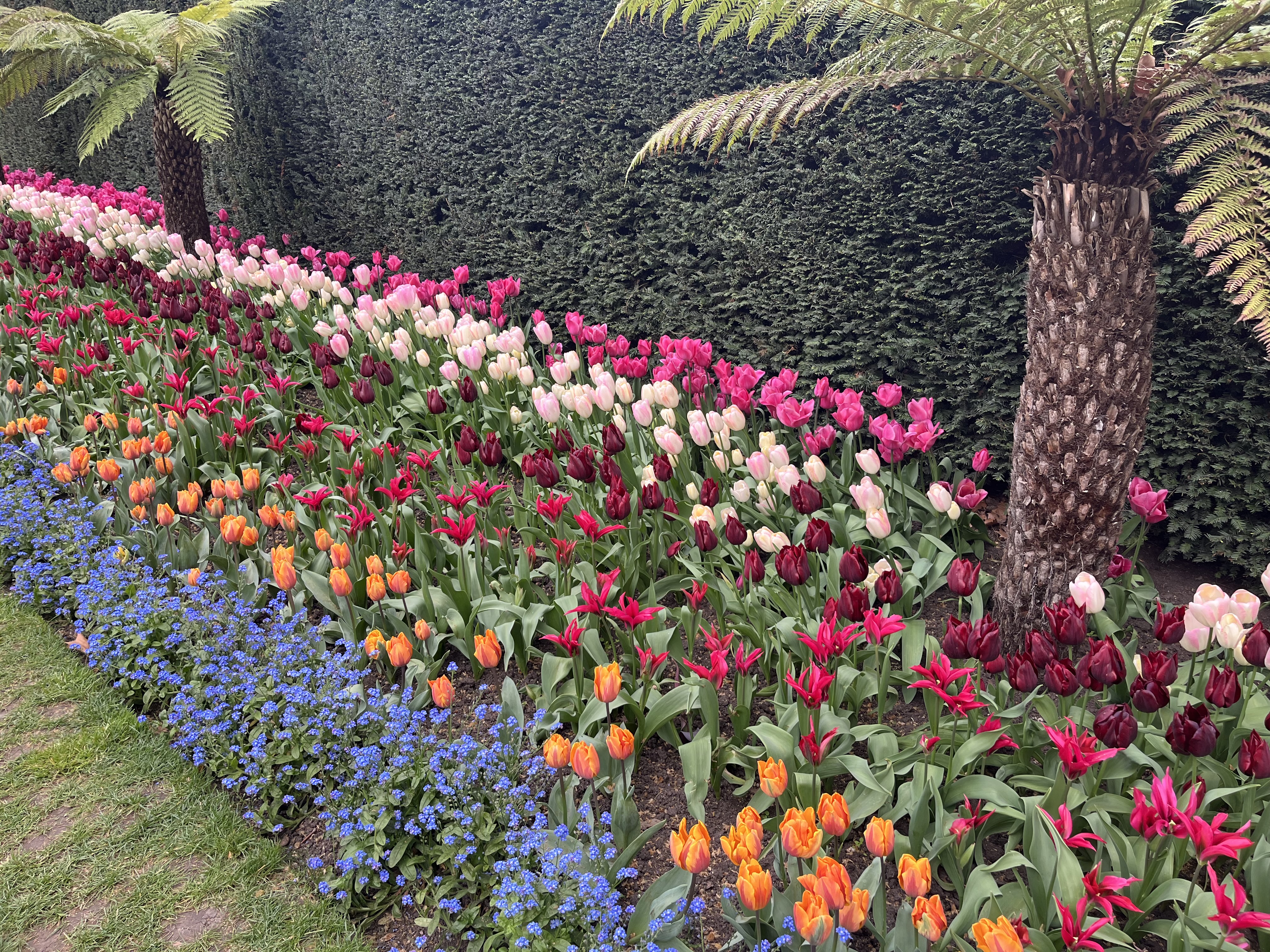 As we were walking back from our post-exhibition Indian afternoon tea at Cinnamon Bazaar, we passed through Charing Cross and spotted the gardens on the embankment below. I don’t think I’ve ever visited them before, but I was immediately drawn to the bright, densely packed tulip beds.